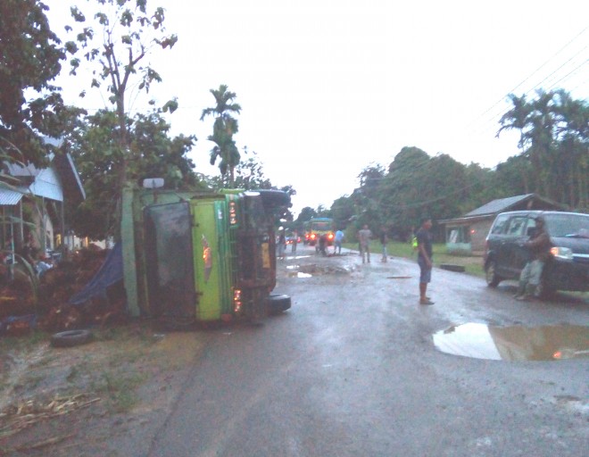 Muarasabak,eNewsTimE.co-Sebuah mobil truk pengangkut sawit terbalik sekitar pukul 17.30 WIB, Rabu sore (12/4) di ruas jalan nasional, dalam Kota Muara Sabak, tepatnya Kelurahan Talang Babat. Mobil tersebut terbalik tidak jauh dari Pusksesmas Talang Babat, akibat semakin buruknya kondisi jalan nasional di kawasan Talang Babat hingga ke Nibung Putih.