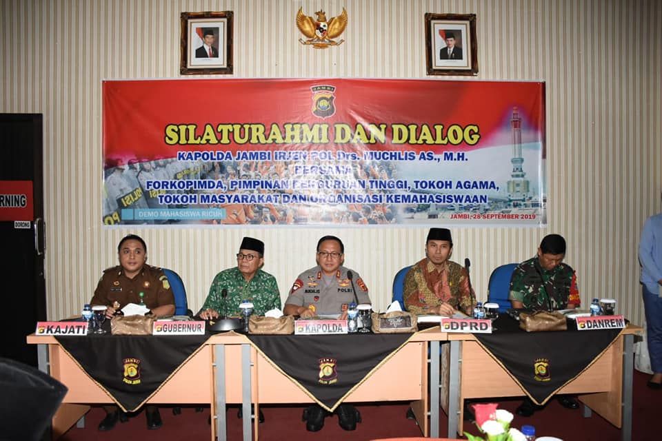 JAMBI, eNewsTimE.co - Menyikapi berbagai isu yang terjadi di berbagai daerah di Indonesia dalam beberapa hari terakhir ini, para pimpinan daerah Provinsi Jambi, yakni Gubernur Jambi, Kapolda Jambi, Danrem 042/Gapu, Ketua DPRD Provinsi Jambi, bersama Tokoh Masyarakat, Tokoh Agama, Organisasi Kemahasiswaan, serta elemen masyarakat lainnya mengadakan pertemuan atau Silaturahmi dan Dialog di Mapolda Jambi untuk mengambil sikap bersama, Sabtu (28/9/19).