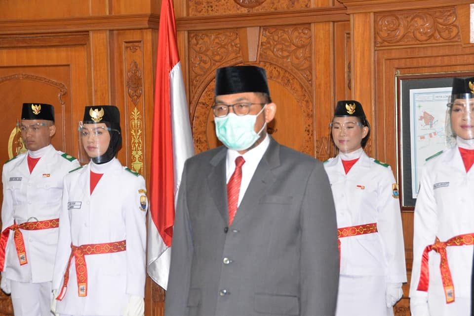 JAMBI, eNewsTimE.co - Penjabat Sekretaris Daerah (Pj.Sekda) Provinsi Jambi H.Sudirman,SH,MH didampingi Plt. Kepala Dinas Pemuda dan Olahraga Provinsi Jambi Ronaldi mengikuti Pengukuhan Anggota Paskibraka (Pasukan Pengibar duplikat Bendera Pusaka) yang dipimpin oleh Presiden RI Ir.H.Joko Widodo (Jokowi) Kamis, (13/08/2020). Jokowi mengukuhkan delapan anggota Paskibraka yang akan bertugas pada saat HUT ke-75 RI di Istana Negara, juga diikuti dengan pengukuhan serentak Paskibraka Tingkat Provinsi, yakni 34 provinsi seluruh Indonesia melalui daring atau video conference. Pj.Sekda mengikuti pengukuhan tersebut di Ruang Rapat Gubernur, Kantor Gubernur Jambi.