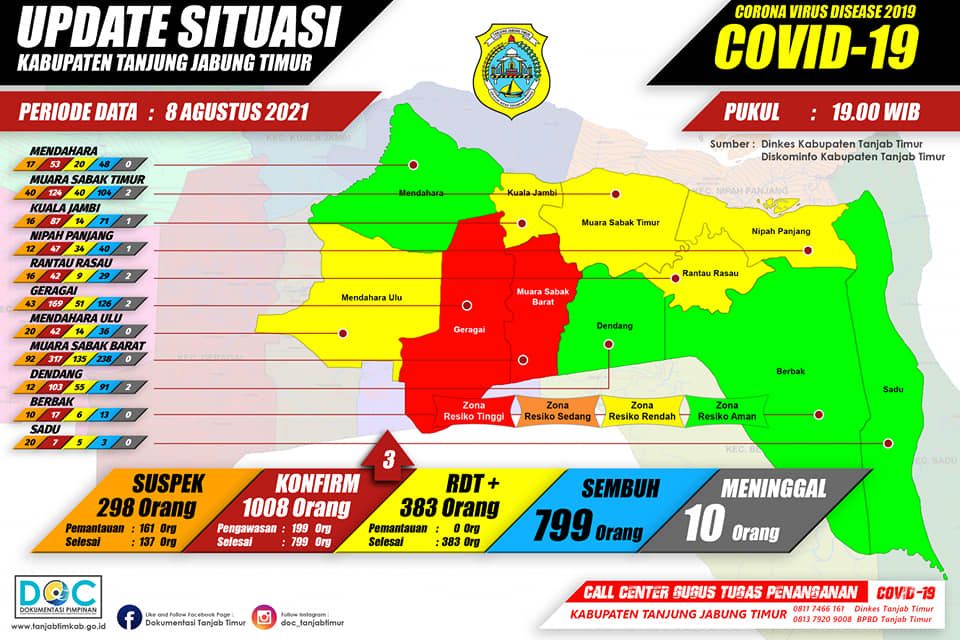 MUARASABAK, eNewsTimE.co - Kasus terkonfirmasi Positif Covid-19 di Kabupaten Tanjung Jabung Timur (Tanjabtim), Provinsi Jambi, pada Minggu 8 Agustus 2021 bertambah 3 orang. Dengan demikian total terkonfirmasi Covid-19 sebanyak 1008 orang. Sedangkan 199 orang dalam pengawasan atau perawatan. Sebanyak 799 orang dinyatakan sembuh, sementara 10 orang meninggal dunia.